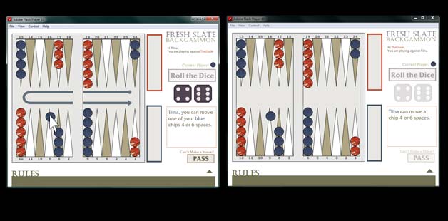 A two-player, online Flash version for one of the oldest board games, Backgammon. Click "Launch Project" to view a short video showing how two different versions of the game interact with each other through Flash Media Server.